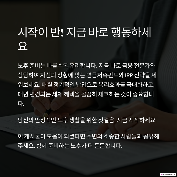 연금저축펀드와 IRP를 적절히 조합하여 활용하는 것이 가장 큰 세금 절감 효과를 얻을 수 있는 전략입니다. 개인의 상황에 맞게 두 상품을 최적화하여 활용한다면, 노후 준비와 세금 절감이라는 두 마리 토끼를 모두 잡을 수 있을 것입니다.